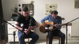 The two first met as teenagers some thirty years ago and over the decades have made music together in kitchens, bars, pubs and occasionally on stage, and in the studio. Donald plays Scottish small pipes fitted with his signature Lindsay System chanter, alongside twelve-string guitar and whistle while Alasdair contributes six-string acoustic guitar. Both sing – sometimes solo, sometimes in close harmony.